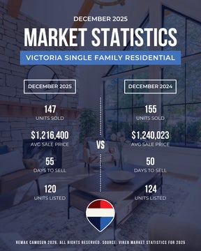 January 2, 2026 A total of 367 properties sold in the Victoria Real Estate Board region this December, 12.8 per cent fewer than the 421 properties sold in December 2024 and 18.6 per cent fewer than in November 2025. Sales of condominiums were down 21.5 per cent from December 2024 with 106 units sold. Sales of single family homes decreased by 2.6 per cent from December 2024 with 186 sold.There were 6,918 sales over the course of 2025, a 0.36 per cent increase from the 6,893 sales in 2024."2025 was another consistent year for local real estate," said 2026 Victoria Real Estate Board Chair Fergus Kyne. "Despite global economic uncertainty, property sales in the Victoria market were steady and pricing remained relatively balanced. One of the most significant factors in 2025 was the amount of available inventory. We saw the second highest number on record of new listings enter the market. The ample inventory was good news for sellers and for the stability of our market. Buyers had more choice and time to make decisions, while sellers benefitted from clearer expectations around pricing and timelines."There were 2,544 active listings for sale on the Victoria Real Estate Board Multiple Listing Service® at the end of December 2025, a decrease of 19.3 per cent compared to the previous month of November but an 11.1 per cent increase from the 2,290 active listings for sale at the end of December 2024.The Multiple Listing Service® Home Price Index benchmark value for a single family home in the Victoria Core in December 2024 was $1,316,700. The benchmark value for the same home in December 2025 decreased by 4.7 per cent to $1,255,000, down 1.7 per cent from November's value of $1,276,700. The MLS® HPI benchmark value for a condominium in the Victoria Core area in December 2024 was $546,100 while the benchmark value for the same condominium in December 2025 increased by 0.7 per cent to $549,900, a decrease of 0.6 per cent from the November value of $533,100.Original source: