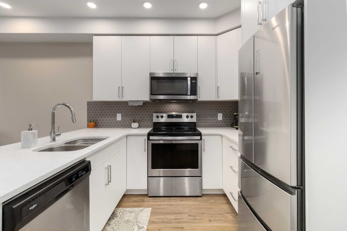 This one-bedroom, one-bathroom home offers bright, open-concept living designed for modern life. The kitchen anchors the space with quartz countertops, full-height cabinetry, stainless steel appliances, and a generous island perfect for cooking, hosting, or working from home.- Secure underground parking