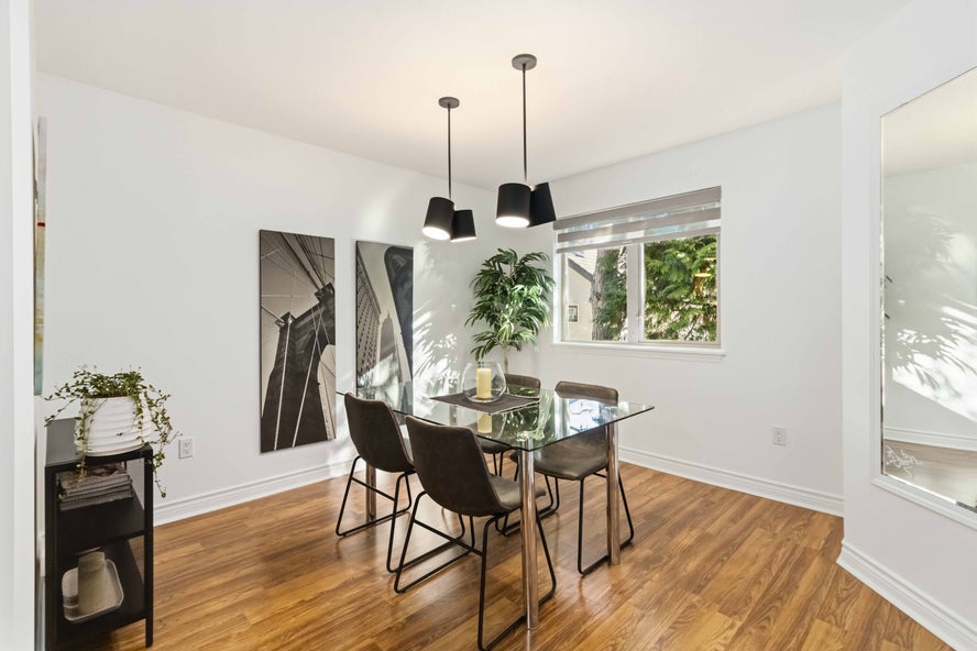One of the standout features of this home is the bright and inviting living area. Expansive windows fill the living and dining space with natural light throughout the day, creating a warm and welcoming atmosphere. A charming wood-burning fireplace adds character and comfort, making the space perfect for relaxing evenings at home. Sliding doors lead to a large private balcony, an ideal spot to enjoy morning coffee or unwind at the end of the day.