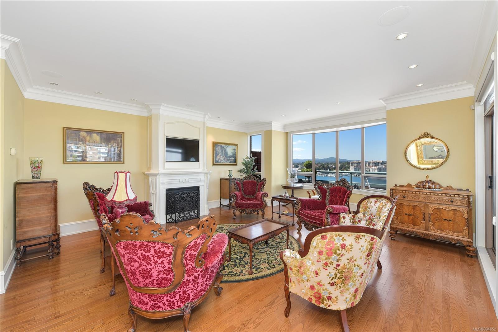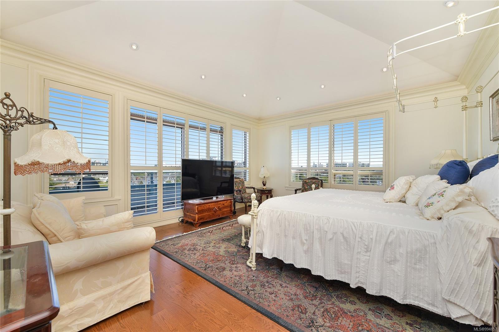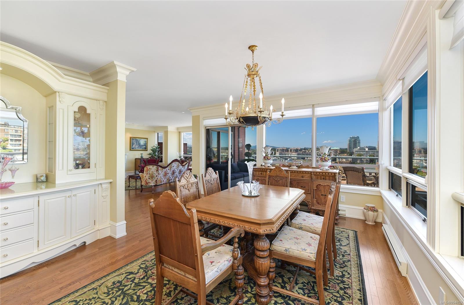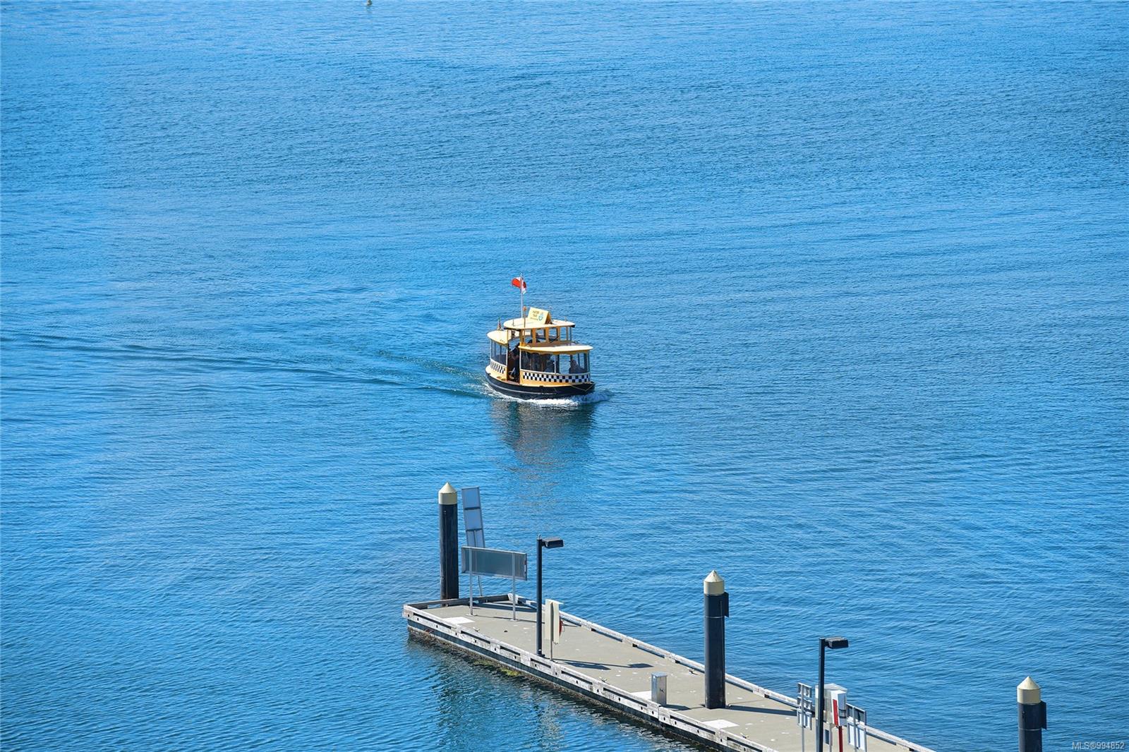 Sweeping, jaw dropping views of Victoria’s acclaimed Inner Harbour. Extremely rare WATERFRONT PENTHOUSE CONDO. This top floor residence offers just over 2600 Sq.Ft. of interior living space ( 2 Beds + Den ) coupled with 4 Deck choices with more than 1100 Sq.ft. providing 360 degree views. Your choice of two front entry ways to brilliant open spaces in your main living/dining/kitchen with heaps of natural daylight. High-end appliances from Wolf, Sub-Zero & Miele compliment the well positioned kitchen with a charming eating nook. Oak H/Wood throughout + stunning tile. 9 Ft. Ceilings. Bedrooms & den are situated on the east wing of the suite providing excellent separation from the living spaces. Relax in your spacious primary suite with its stunning 14’ vaulted ceiling & power blinds. Summertime happy hours will be the envy of the neighbourhood with all your outdoor space. Steel & Concrete Building. 2 side x side parking stalls. Seaside walk paths below + quick access to all amenities in the James Bay and Inner Harbour area. This is a unique and one of a kind condo. Live above it all here at The Harbourside Penthouse Collection. Ask your realtor to secure a private viewing.