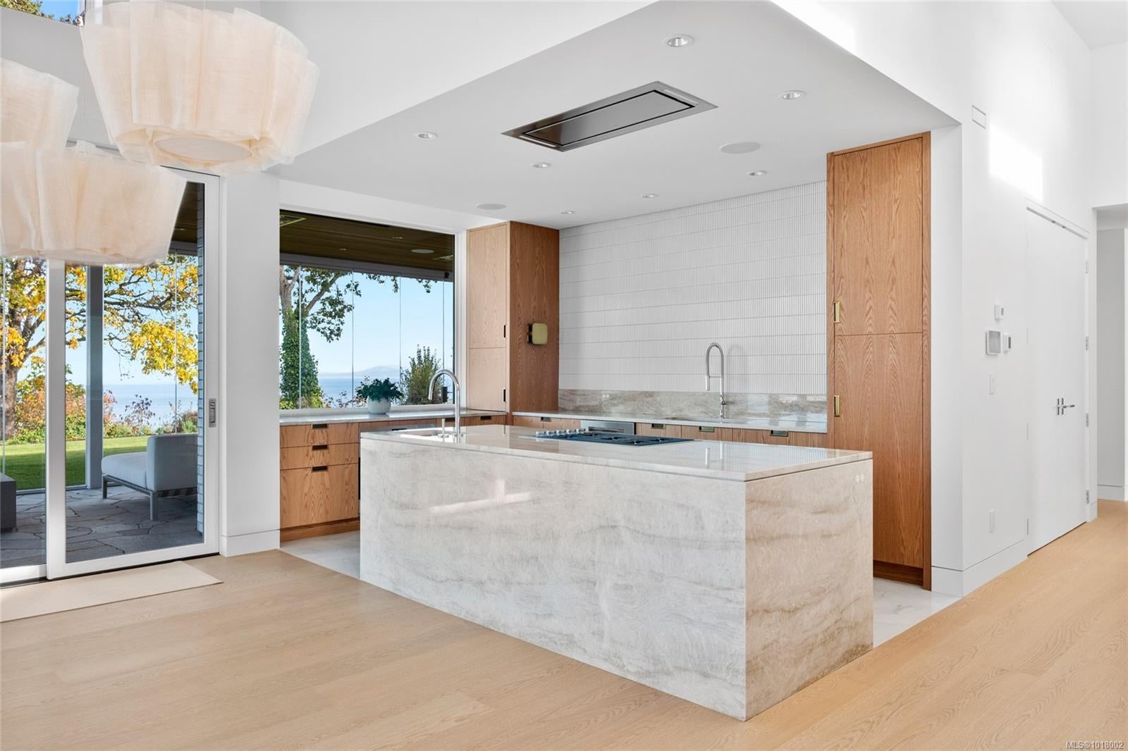 Welcome to Celosia. A sophisticated oceanfront home built by GT Mann from a Ryan Hoyt design. Jenny Martin Design rounds out the award-winning team to create a living experience worthy of its breathtaking oceanfront setting. Timeless Mid-Century Modern elements blend seamlessly with comfortable elegance & a hint of Italian flair. At the heart of the home lies a stunning kitchen featuring custom oak cabinetry, Taj Mahal quartzite counters & island with Palladiana marble flooring made onsite from a local quarry—truly one of a kind. Premium Wolf, Sub-Zero & Dacor appliances elevate the culinary experience. The living room is bathed in light from clerestory windows & anchored by a striking stone fireplace with custom surround. Hidden behind bespoke millwork is a charming record niche—one of many thoughtful details. Two primary suites capture sweeping ocean views, each a private retreat with warm oak flooring, imported Japanese wallpaper & spa-inspired ensuites. A guest wing with two additional bedrooms & a 5-piece bathroom offers the same comfort & luxury. The lower level is designed for wellness & play, featuring a gym area, workspace & games area. An elevator serves all levels, ensuring accessibility. Perhaps the most impressive feature is the four-season patio, wrapped in a Lumon glass system with frameless, retractable floor-to-ceiling panels. Flagstone floors, a gas fire table, radiant ceiling heat & a concealed hood fan make this the perfect year-round gathering space. Step outside to beautifully landscaped grounds & take in panoramic ocean vistas—a front-row seat to nature’s rhythm, framed by the home’s coastal serenity. Located near UVic, schools & shopping, this oceanfront residence is one of Victoria’s truly exceptional properties, offering a lifestyle & setting that are simply unmatched. Celosia is more than a home; it is a work of art—meticulously built for those who value design integrity, luxury materials & timeless architecture.